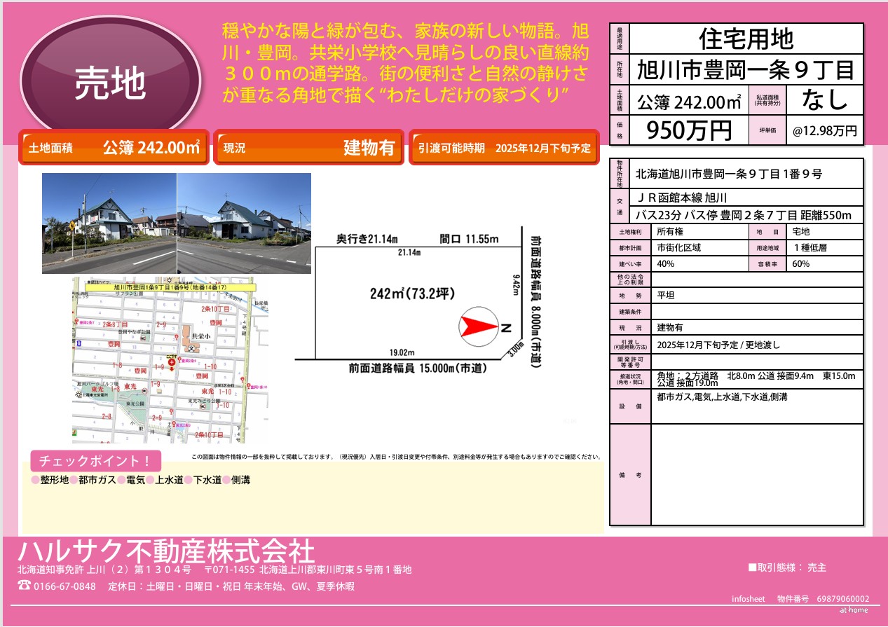 旭川市豊岡1条9丁目(住宅用地) 不動産売却に特化し、戸建て・土地・マンション・歯科医科物件・歯科居抜き物件・店舗付き住宅・事業用物件など幅広い物件の仲介売却を手がける【ハルサク不動産】。こちらでは、当社の取り扱い物件の詳細情報をご紹介しています。 札幌市・江別市・北広島市・恵庭市・千歳市・小樽市・旭川市・東川町の不動産売却なら、ぜひ当社までご相談下さい。歯科・医科の開業・移転・閉院に関するご相談にも対応し、各種手続き等も含めてサポートしております。 物件詳細はこちら 金額 950万円 現況 建物解体更地渡し予定 一覧へ戻る